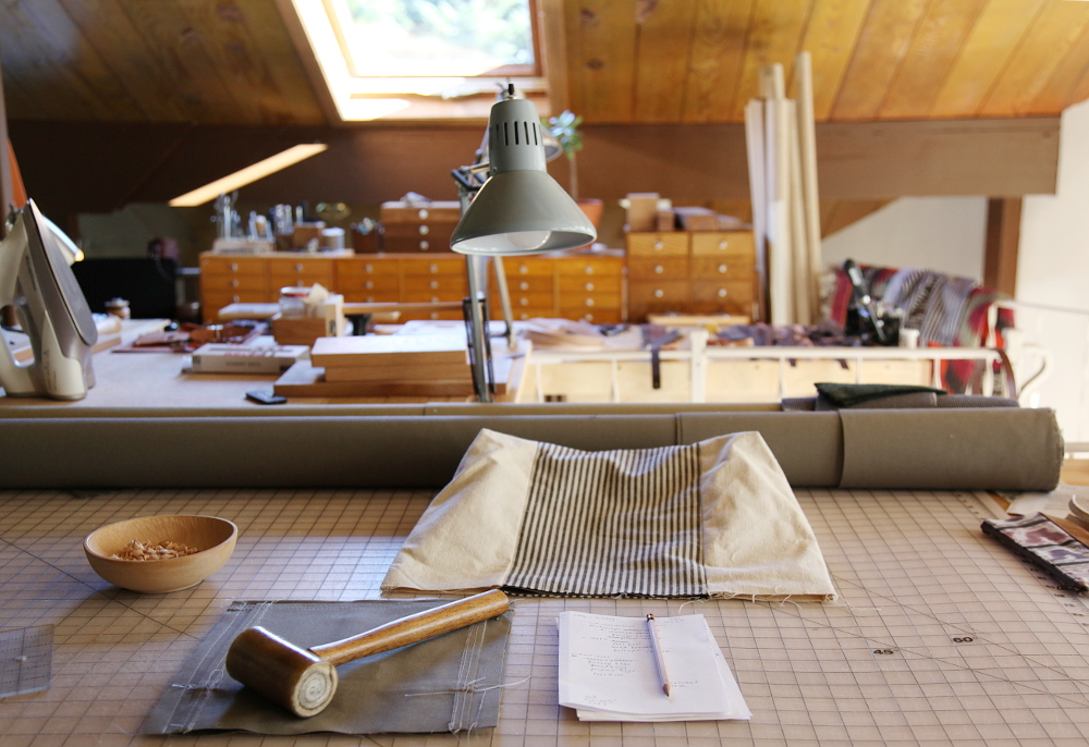 This bench scene I came up to in the studio today – the works in progress left from the day prior – created a similar feeling for me. Wood, cloth, leather, my thoughts being organized on paper – many parts in progress coming into a unified whole.