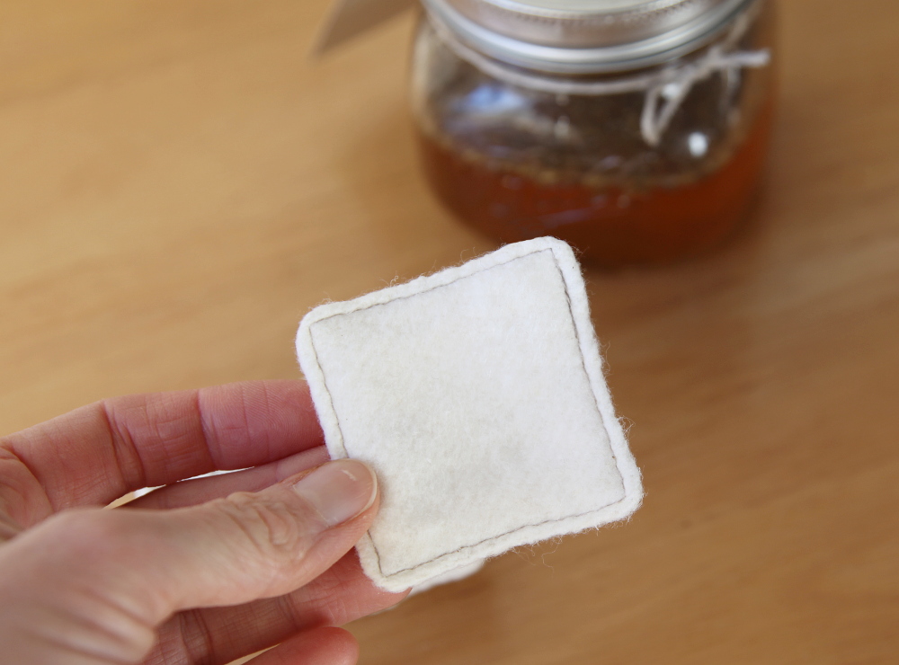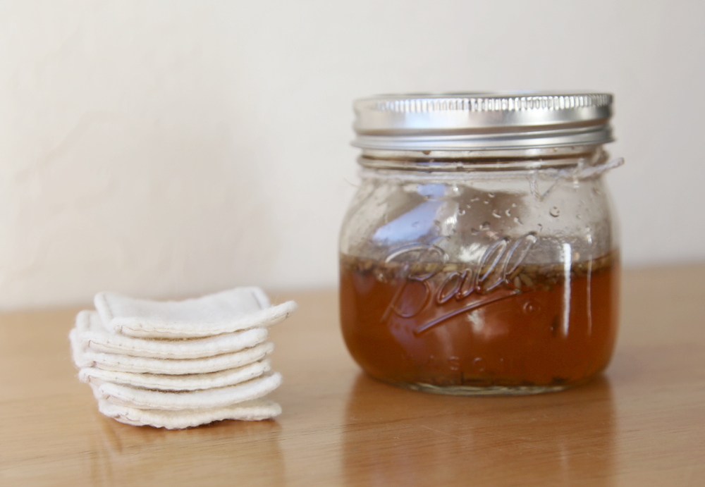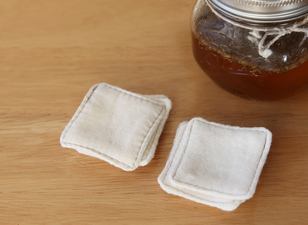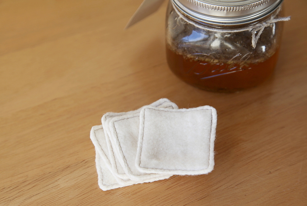 This week I started a batch of Natalie’s lavender skin toner. Witch Hazel, the base of this toner, is something I hadn’t had around since I was a little girl with the chicken pox, and my dad gave me cool witch hazel baths. The smell is still a comfort. Since having it on hand this week, I’ve been enjoying using it as a skin toner on it’s own while I wait for my lavender batch to be ready. After the first night applying it (with a little swatch of toilet paper), I realized I needed a non-disposable solution, and here is what I came up with.