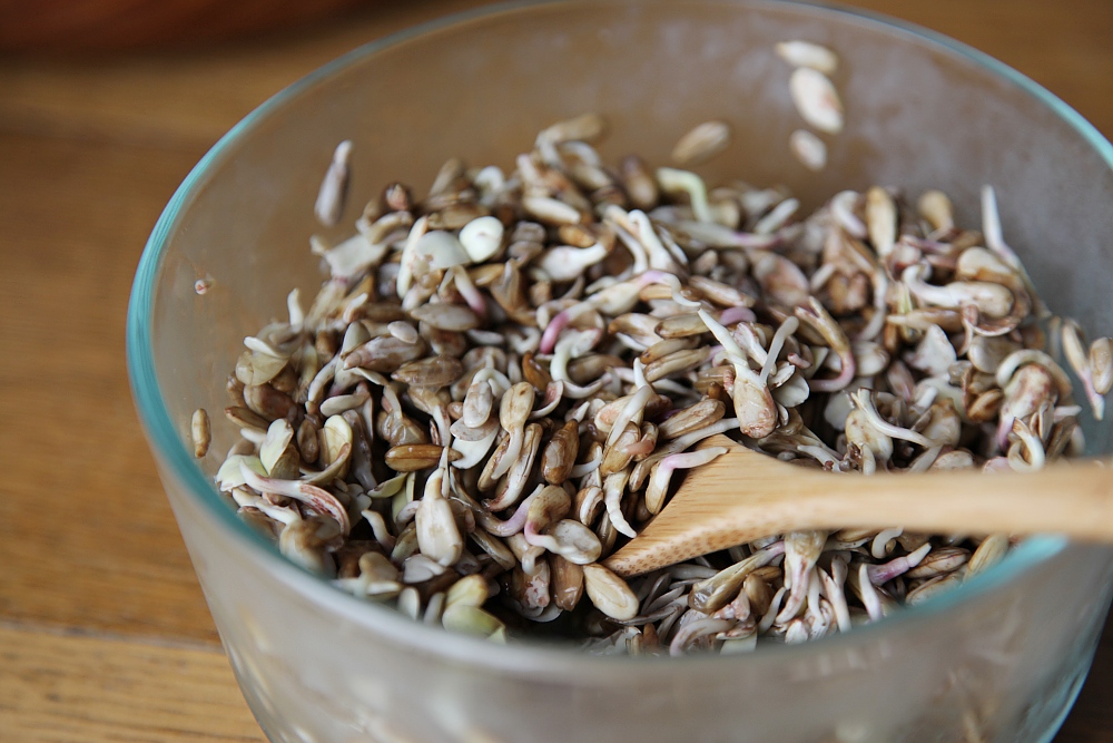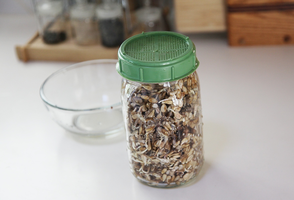 Easy sprouting instructions: In this case I used 1 generous cup of sunflower seeds, which is probably the most you will want to soak in a jar of this size at one time. Cover your seeds with cold drinking water and soak them overnight, or about 10 – 12 hours. Drain the soak water. Fill the jar again and swirl it around to rinse, then drain – repeat this once or twice. Drain off much water as you can (you don’t want standing water or things can get funky in there).